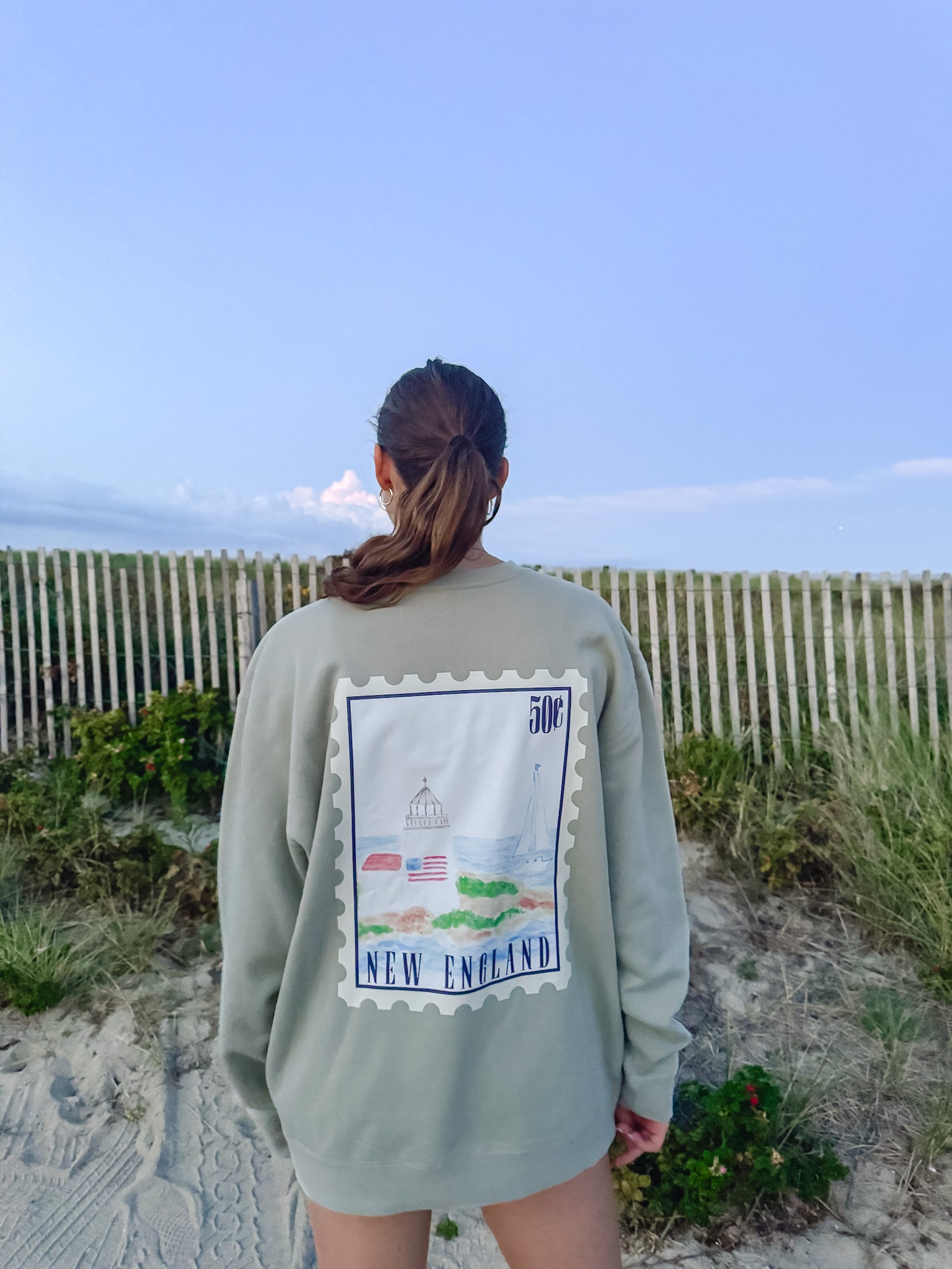 This coastal New England stamped crewneck is a nod to our coastal roots and the nostalgia that comes with the summer here. This piece is extra special to us because we got the pleasure of working with a talented Massachusetts local who painted this gorgeous lighthouse scene!